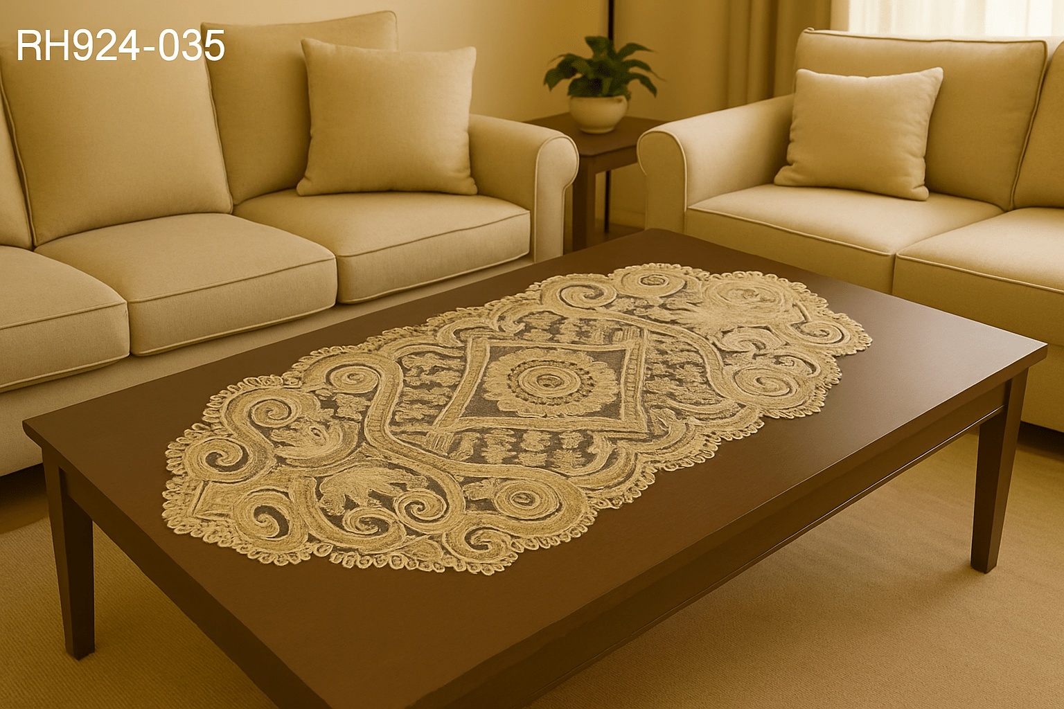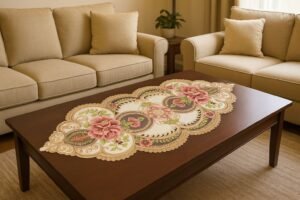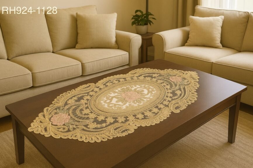 Designed to complement both traditional and modern interiors, this runner sits gracefully on any wooden surface, bringing warmth, sophistication, and subtle luxury to your living space. Perfect for coffee tables, dining tables, sideboards, or console tables, this lace runner is both decorative and durable.