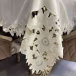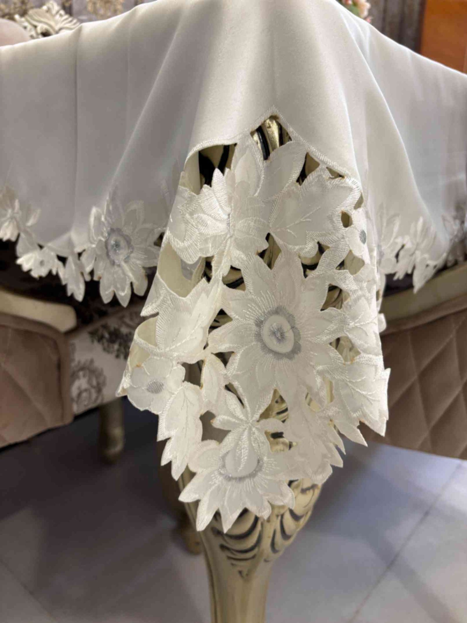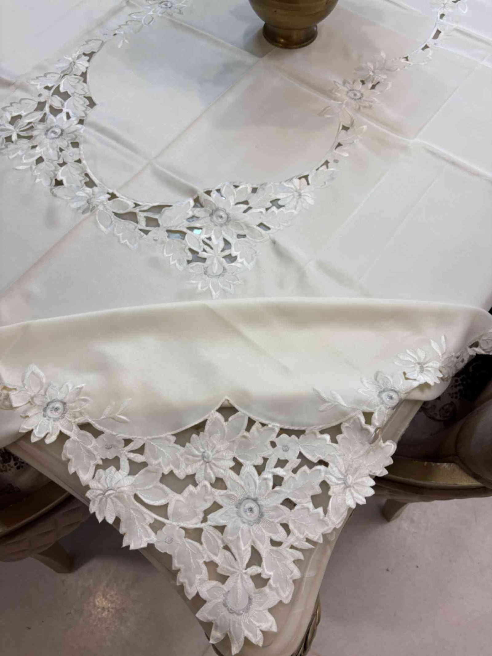 This elegant white table cover features satin-finish fabric with intricate floral embroidery and cutwork edges, making it a perfect fit for 6-seater dining tables. Ideal for formal dining or festive occasions.